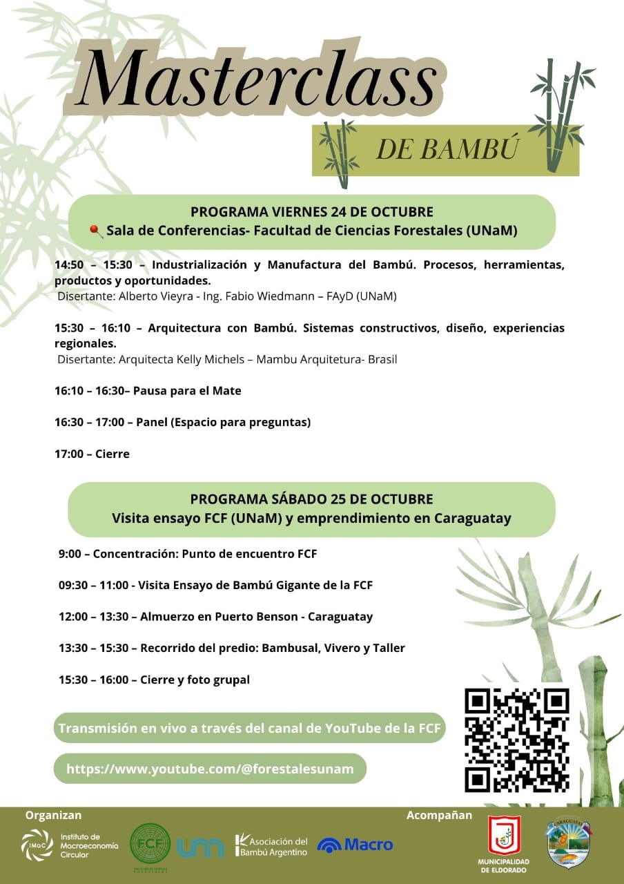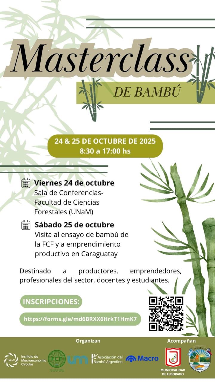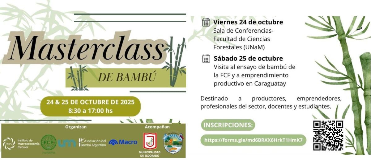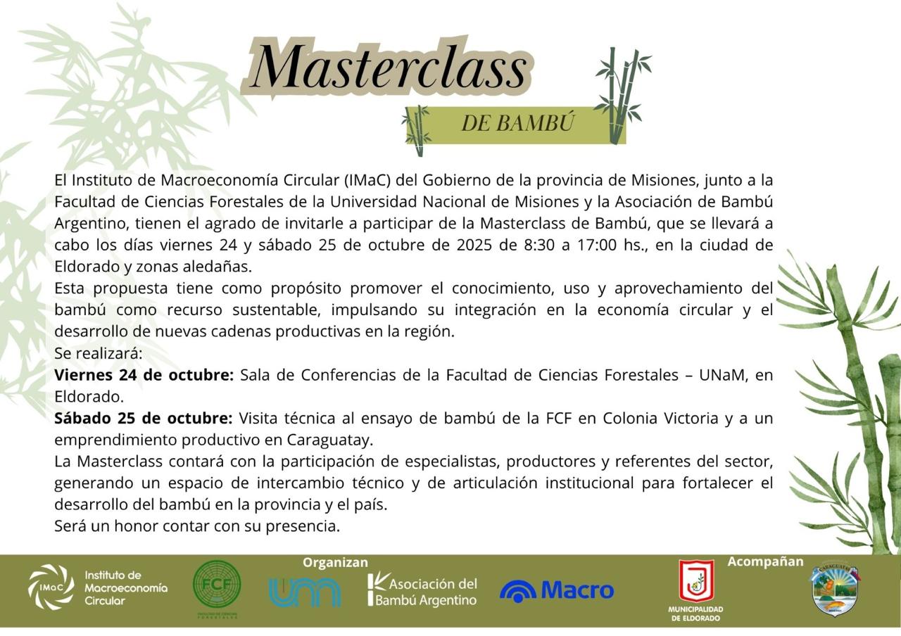 Eldorado. Los días 24 y 25 de octubre de 2025, la ciudad de Eldorado y zonas aledañas se convertirán en el epicentro de una iniciativa que busca fomentar el uso del bambú como recurso estratégico dentro de la economía circular. Se trata de la Masterclass de Bambú, organizada por el Instituto de Macroeconomía Circular (IMaC), en conjunto con la Facultad de Ciencias Forestales de la UNaM y la Asociación del Bambú Argentino.